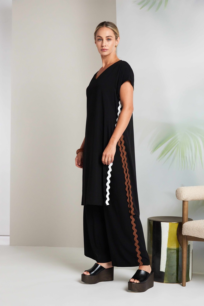 - Design: Wide leg trouser with a stylish contrast ribbon trim running along the side seam.